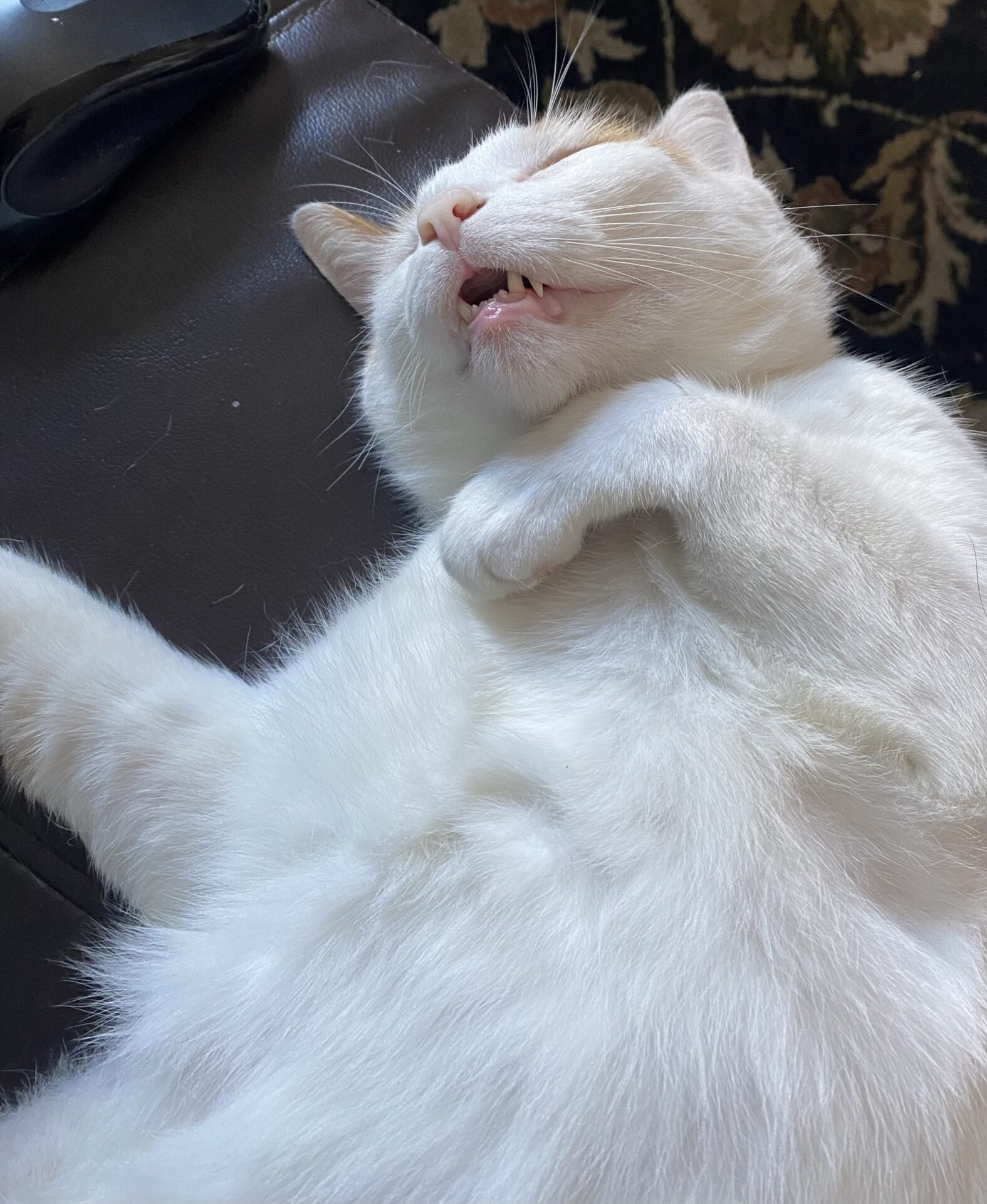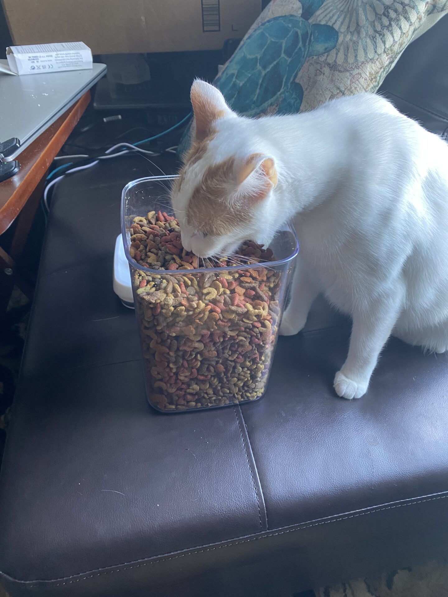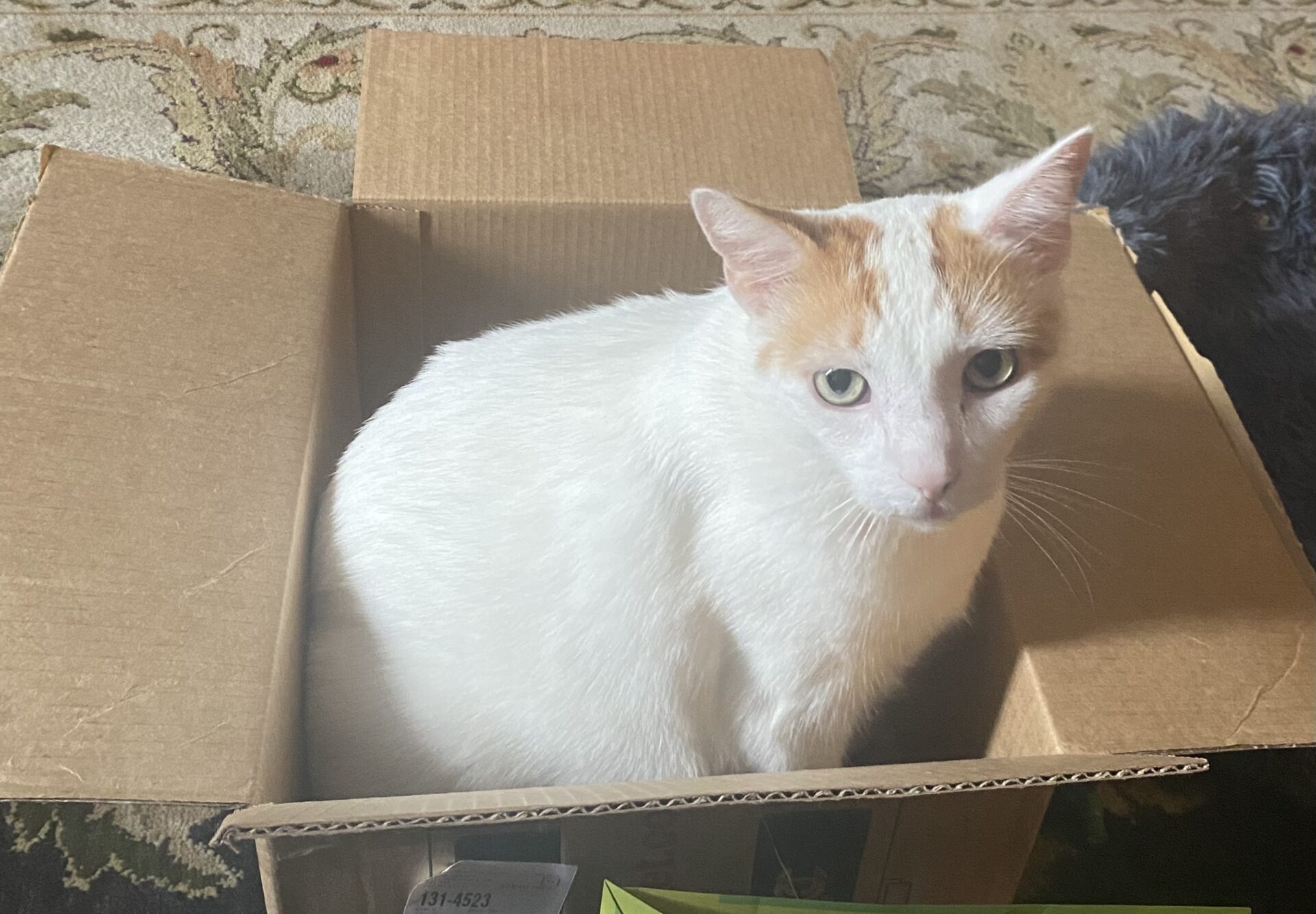 Georgie was left behind by his prior owners in Key West. He wasn’t going to let that keep him down. He quickly took advantage of his neighbors and forced his way into our home. He’s been a purrfect companion ever since. When he’s not in his box, eating or sleeping, he’s playing or begging for treats. He’s the best cuddler and his
